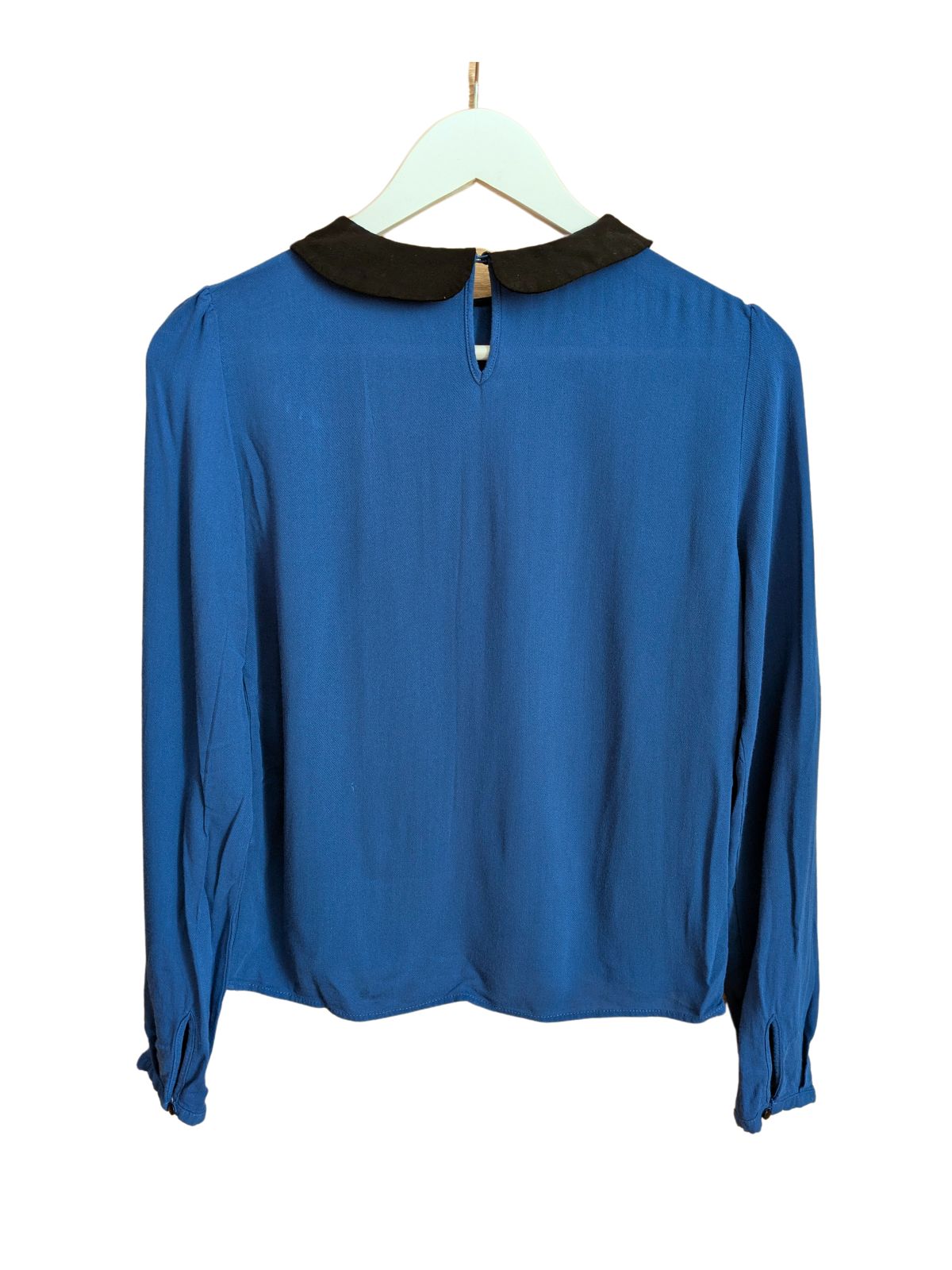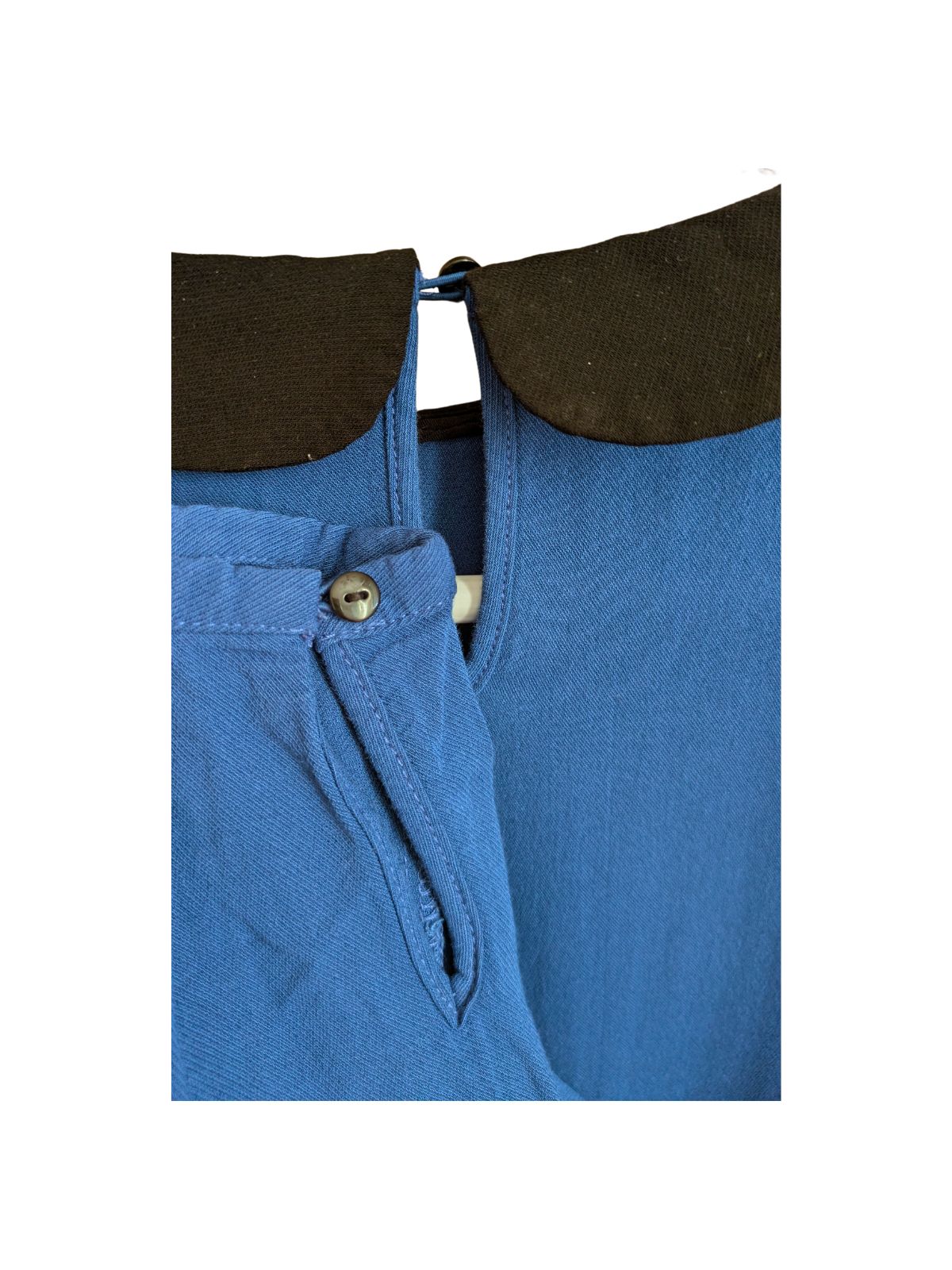 Modro plava bluza s kragnicom i detaljem crnih gumbića. Sastav: nepoznat, vjerojatno pamučna mješavina |