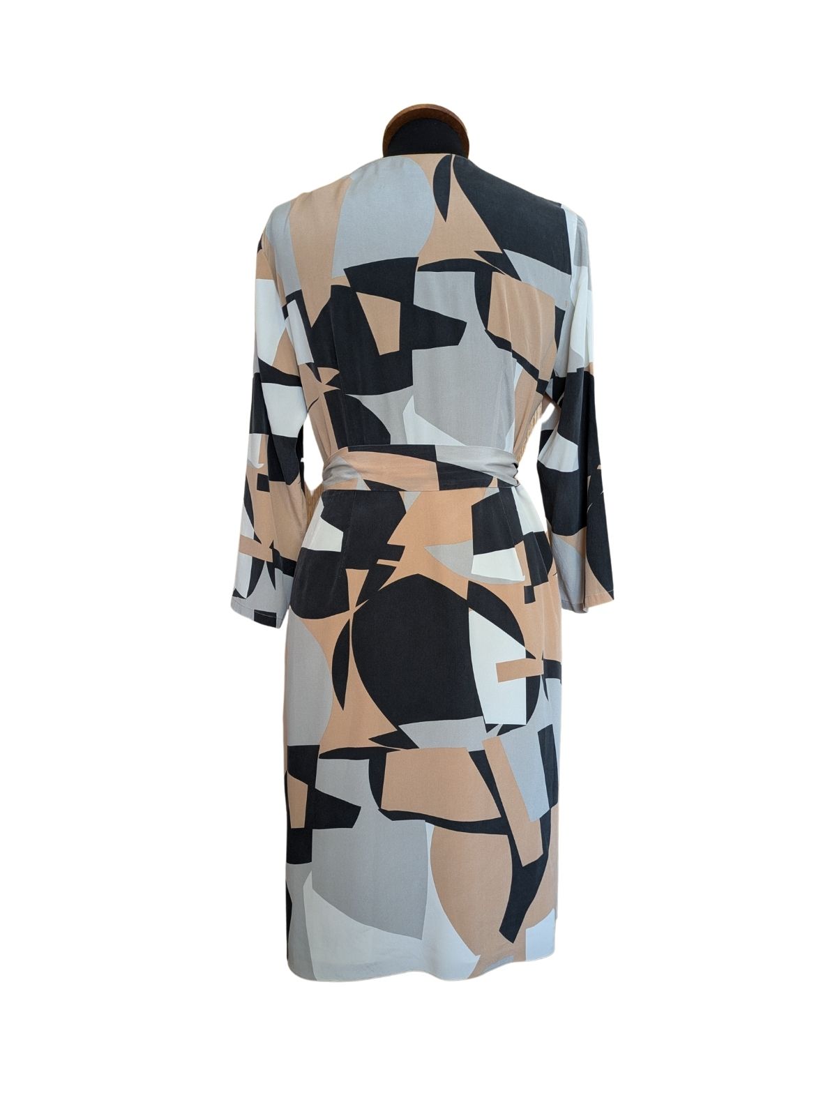 Divna svilena haljina dužine do koljena, s 3/4 rukavima. Šivana je u prsima i donjem dijelu, ali izgledom šava imitira kao da je na preklop, a takav dojam posebno odaju lagano asimetrične falde sprijeda i pojas koji se veže u mašnu. Savršen odabir za svečanije prilike, na crne salonke. Sastav: 92% svila, 8% elastin |