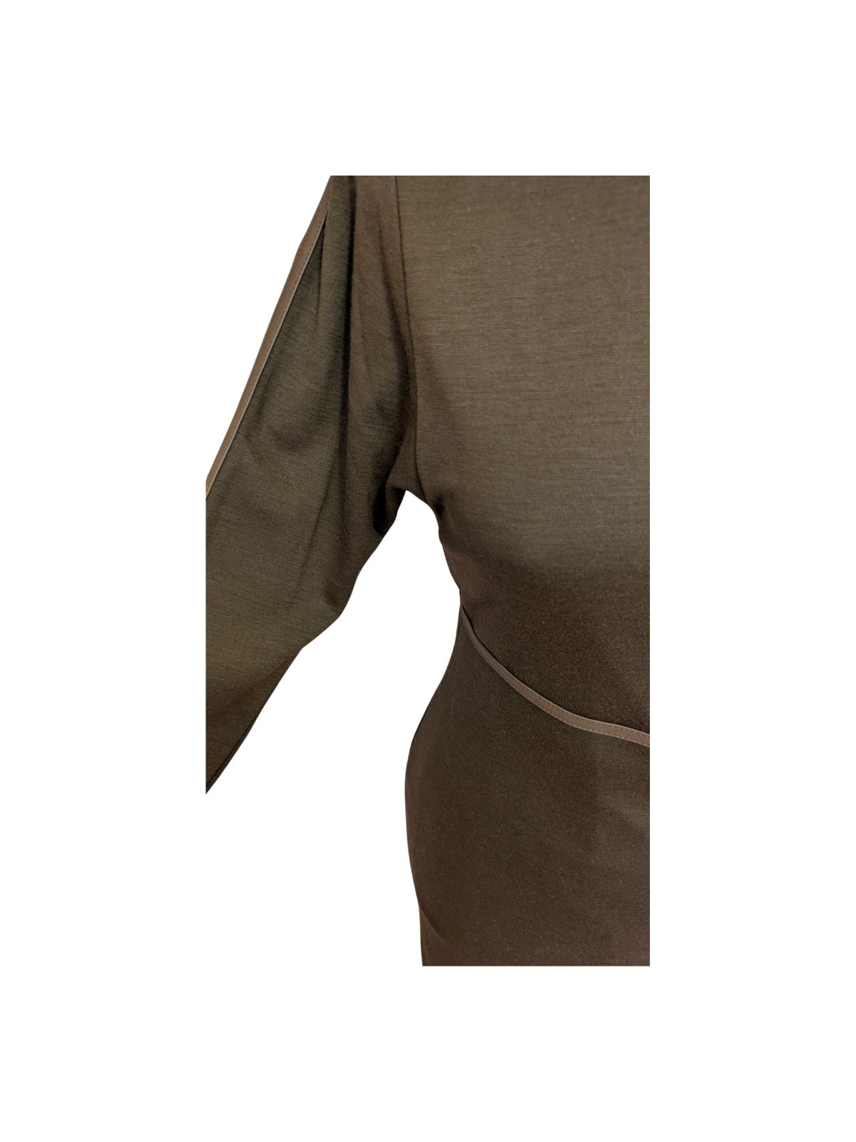 Uska haljina dužine u ravnini koljena, s postavom. Detalji su trakice od imitacije kože u struku i po dužini rukava, te mali zatvarači (ciferšlusi) na rukavima. Rukavi su šivani šire od ramena do zapešća. Sastav: nema etikete, vjerojatno pamučna mješavina s elastinom. |