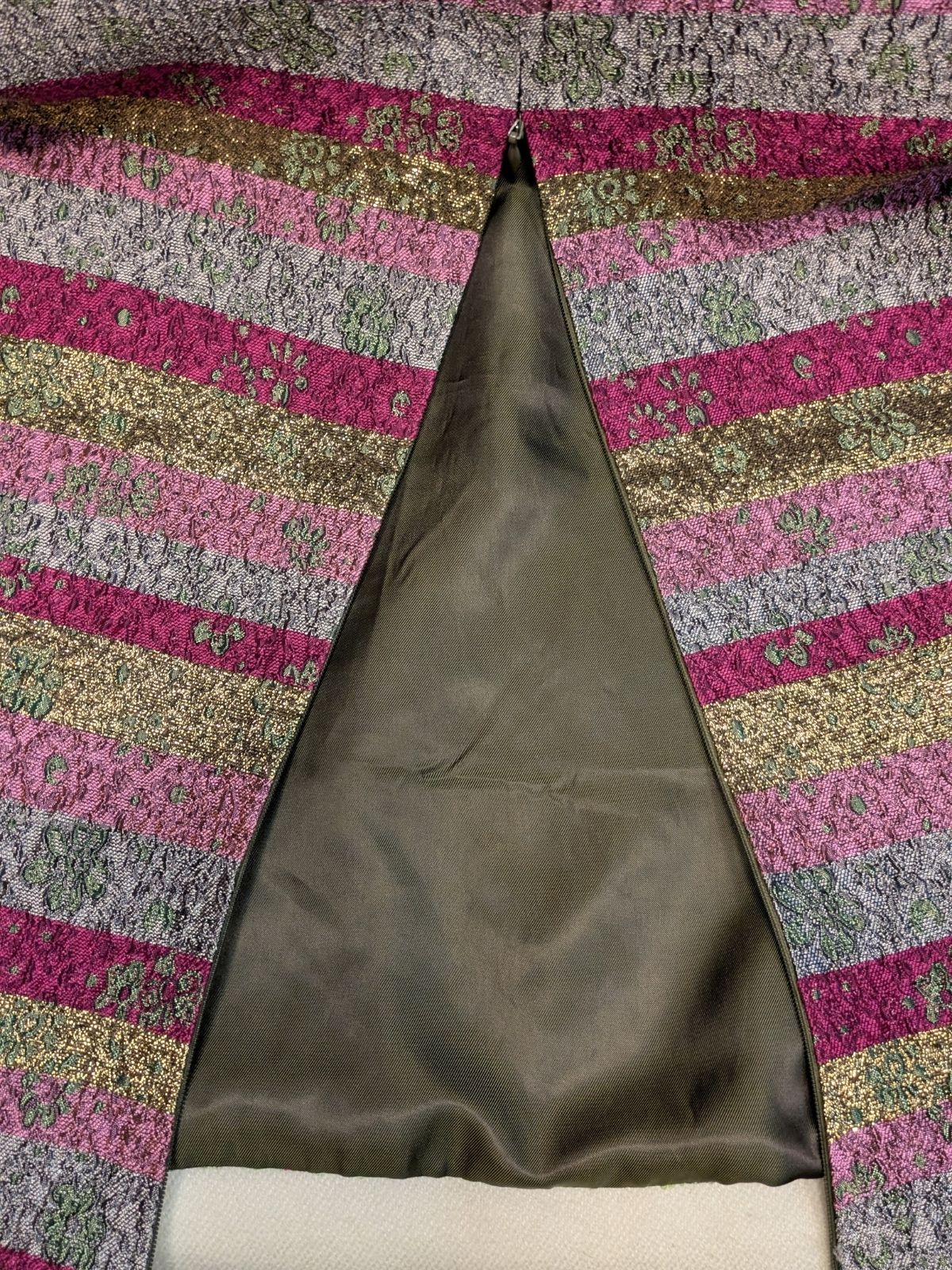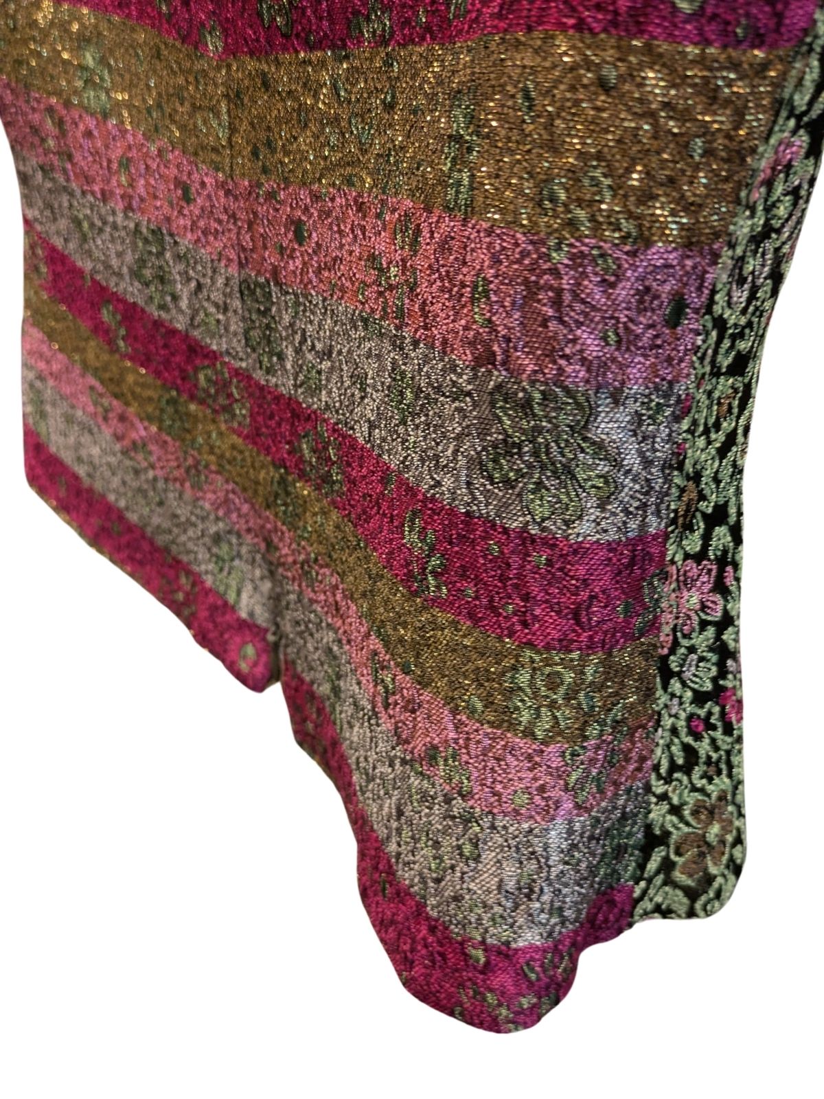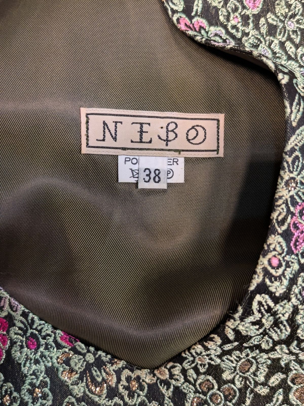 Svileni prsluk s vezom cvjetova i zlatnim nitima. Vez je drugačiji sprijeda i straga, a na leđima je i zatvarač (ciferšlus). Vintage znalci će prepoznati da je ovo rijedak dragulj koji samo modna kuća NEBO može ostaviti iza sebe.