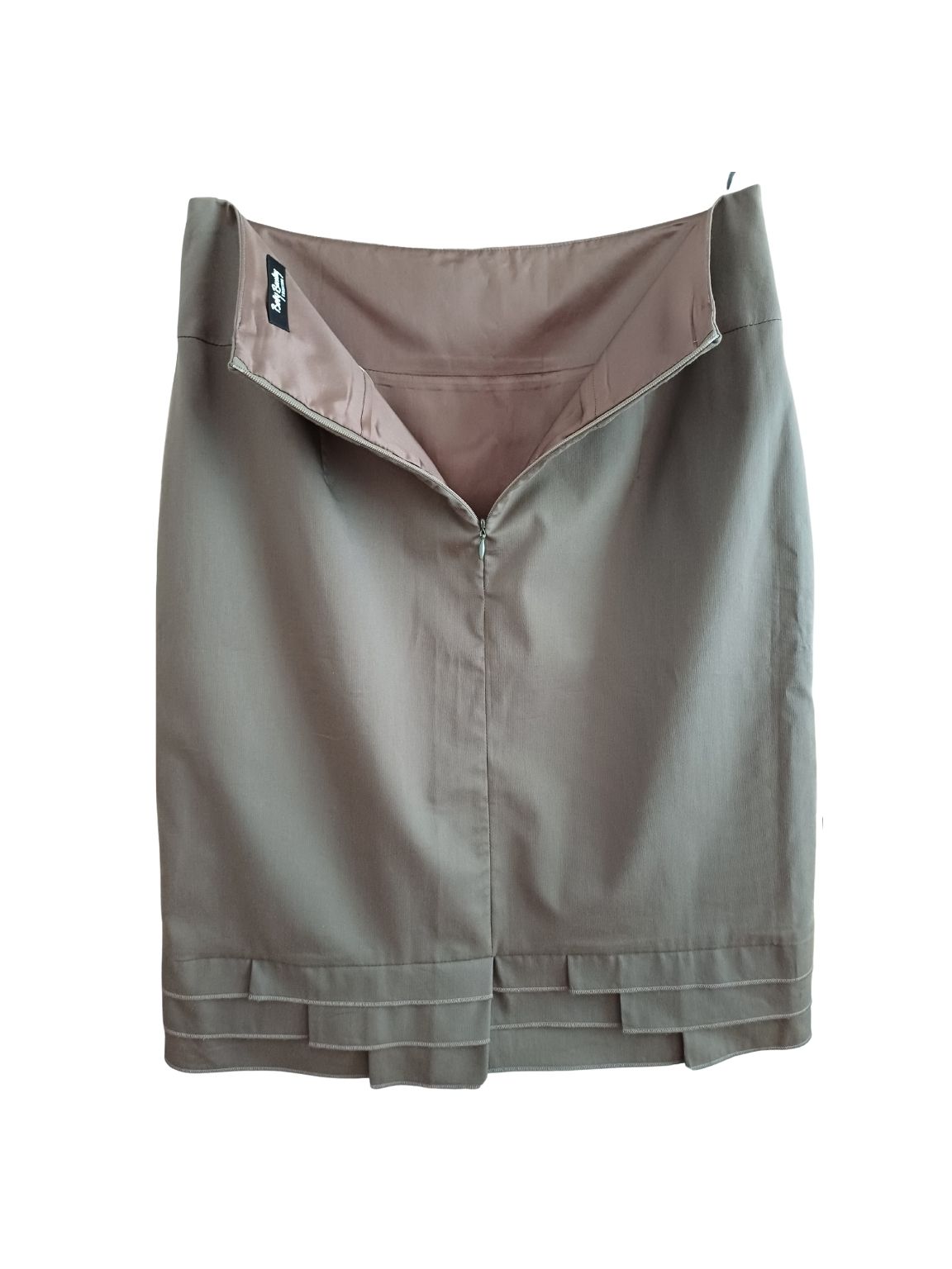 | Suknja do koljena s detaljem "ozbiljnih" volančića Boja: siva, maslinasto zelena Veličina: 38/M |