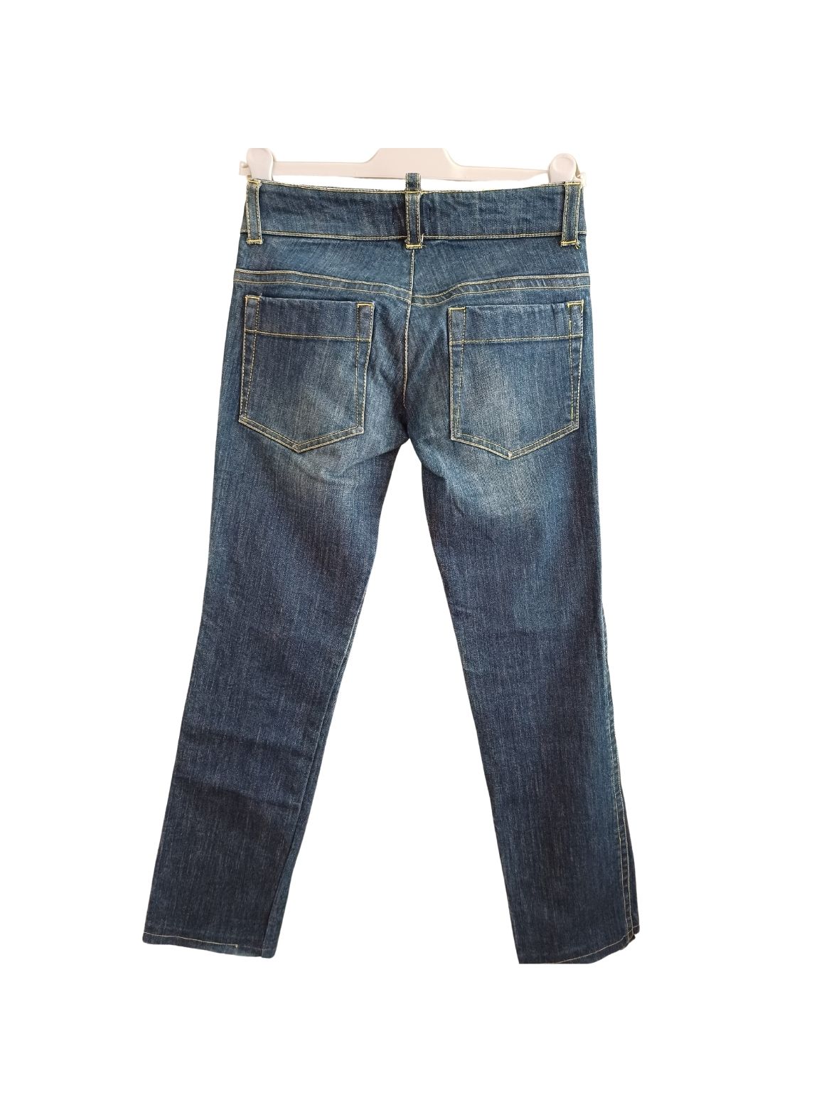Traperice niskog struka i ravnog kroja nogavica, s detaljem žutog konca, pasat će odlično na tenisice i balerinke. Sastav: nepoznat, vjerojatno mješavina pamuka s elastinom Boja: tamno plava s izbijeljenim dijelovima |