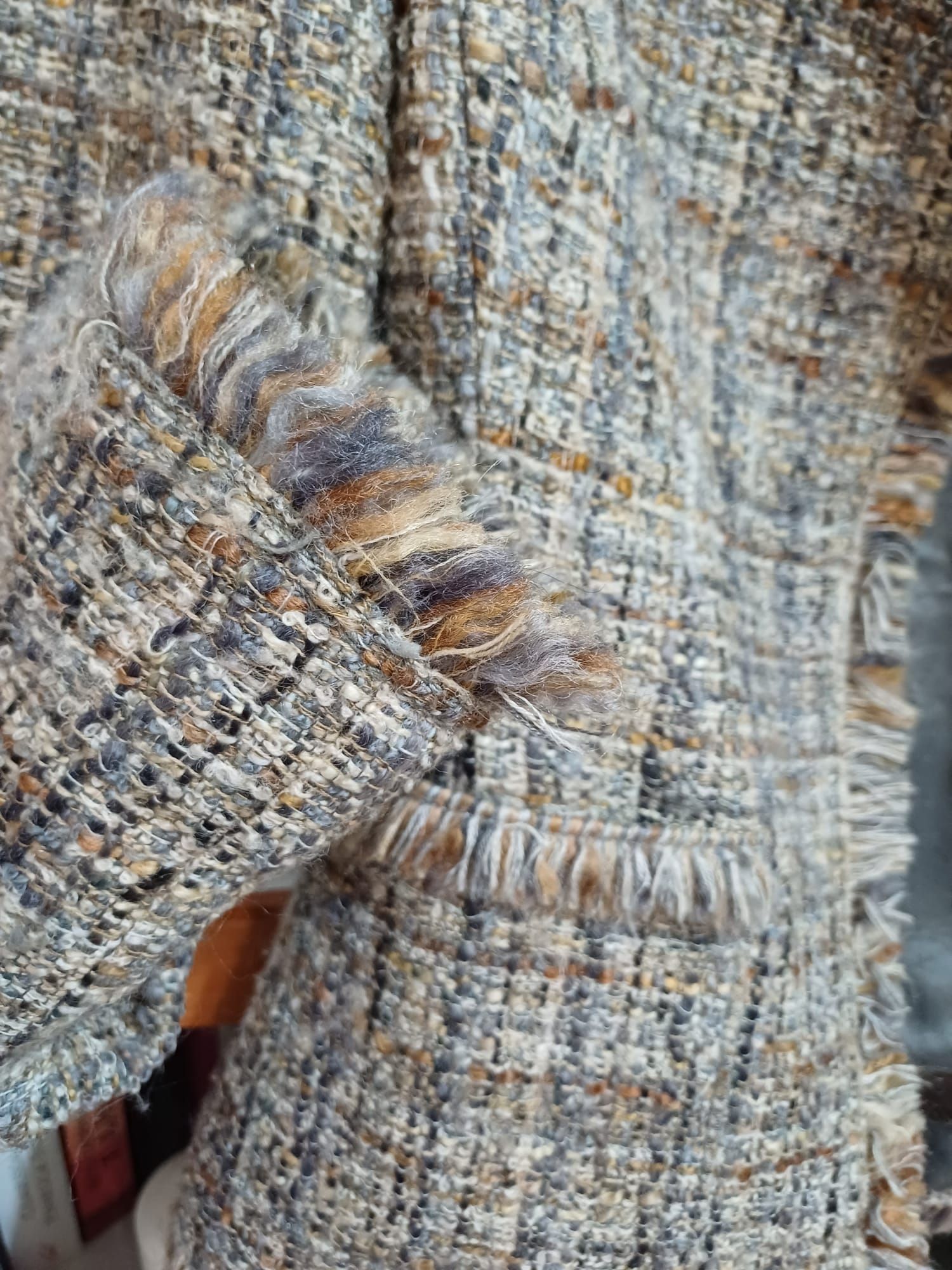 Vuneni sako s efektom vunenih trakica. Sastav: 83% virgin wool, 16% pamuk, 1% viskoza Podstava: 100% viskoza Boje: siva, plava, bež |