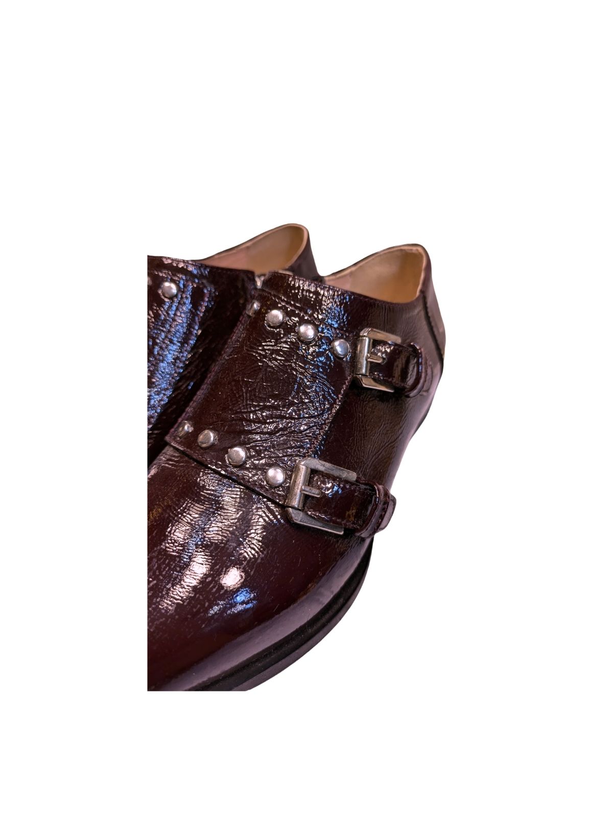 | Kožne lak cipele s detaljima u hit tamno bordo boji, s detaljima zakovica. Nisko ispod gležnja, sa kopčanjem na cif sa strane. Nove nenošene. | |